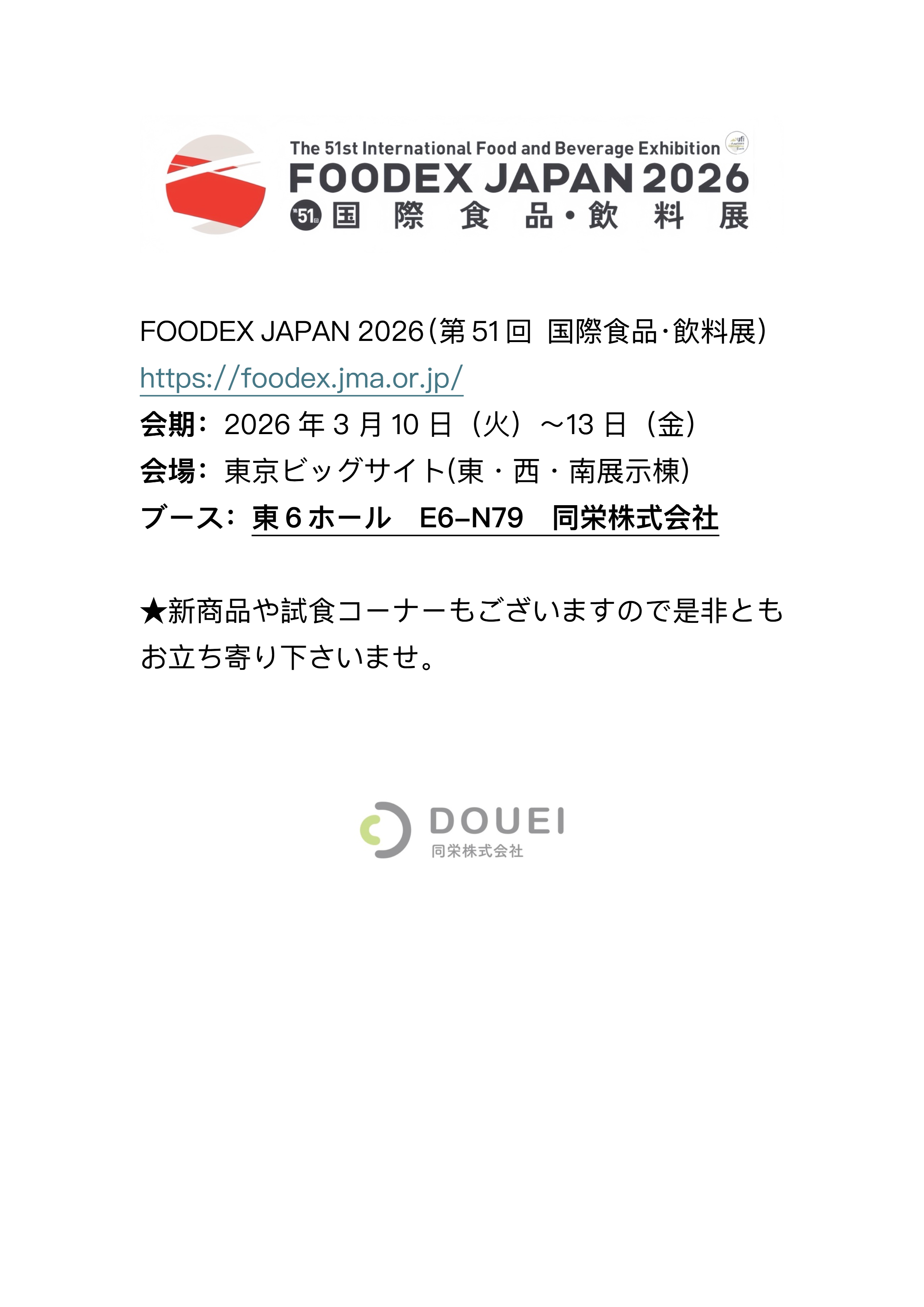 FOODEX JAPAN 2026(第51 回 国際⻝品・飲料展)に出展いたします